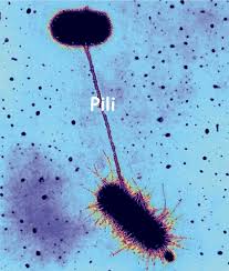 Fimbrias y Pilis. El 1º, fimbria, participa en la adhesión de las bacterias al medio y/u hospedador (son más cortos y numerosos) y el 2º, pili sexual, en la transmisión de la información genética durante la conjugación (menos numerosos y de mayor longitud)